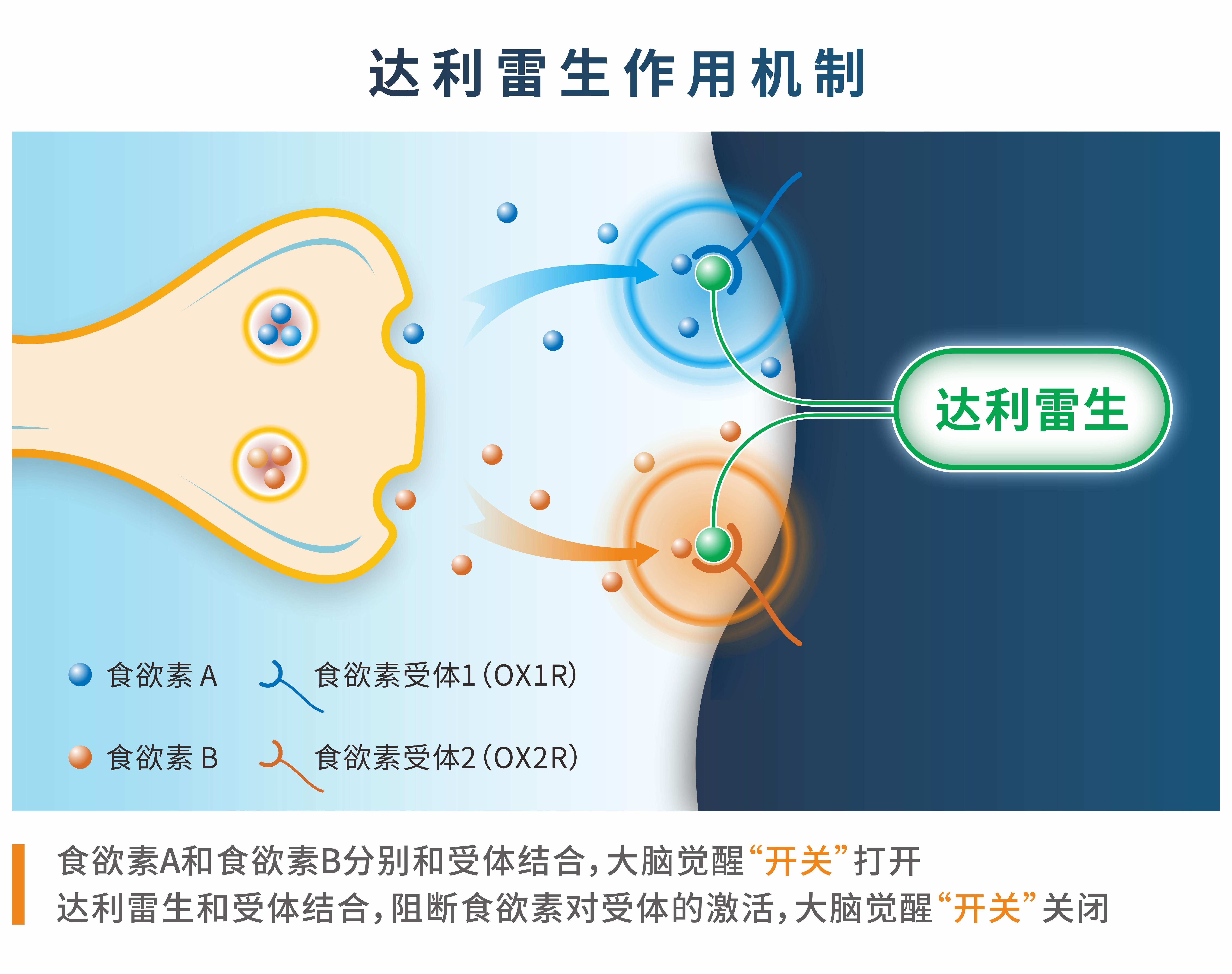目前,达利雷生已在美国、英国、瑞士、日本、加拿大等10多个国家和地区获批上市,是目前唯一获欧洲药品管理局批准的改善日间功能的双食欲素受体拮抗剂(DORA)类抗失眠药。