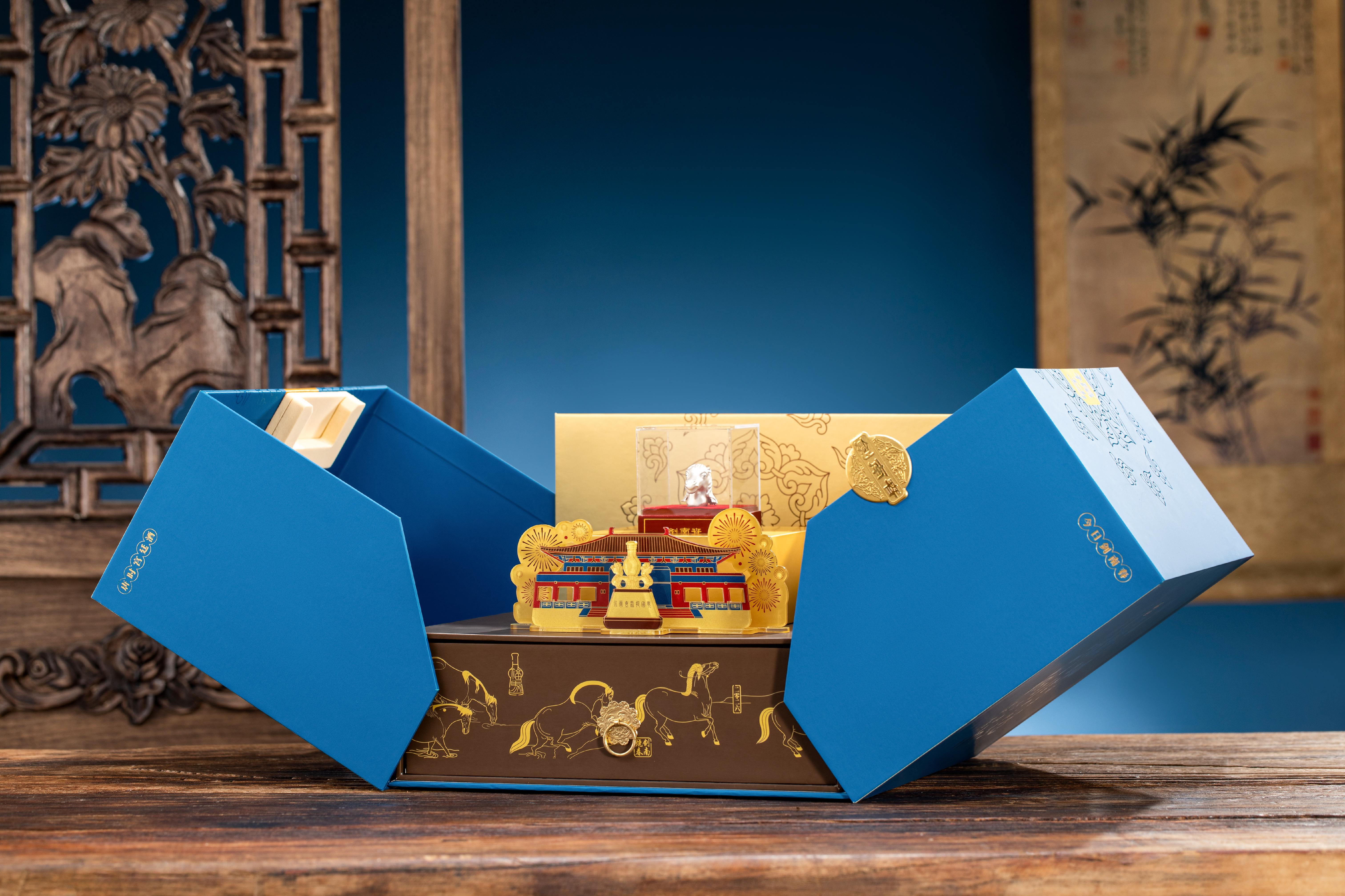 该产品借陕西历史博物馆馆藏精品“莲花瓣纹金碗”“鎏金舞马衔杯纹银壶”等盛唐金银器之魄,是剑南春文创产品的又一次突破。