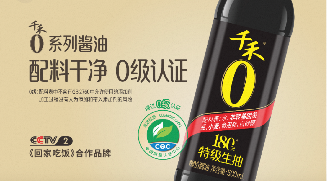 在会上,该品牌宣布其千禾0系列酱油酿造仅使用4种、5种及其他食品配料,配料干净无添加,通过了中国质量认证中心的现场审核、抽样检测和跟踪审核,荣获中国调味品行业首个清洁标签产品0级认证。此外,你或许已经在货架上看到了千禾味业产品的包装焕新——它成为行业首家将配料表放置在包装正面,清晰标示酿造所用配料的品牌。