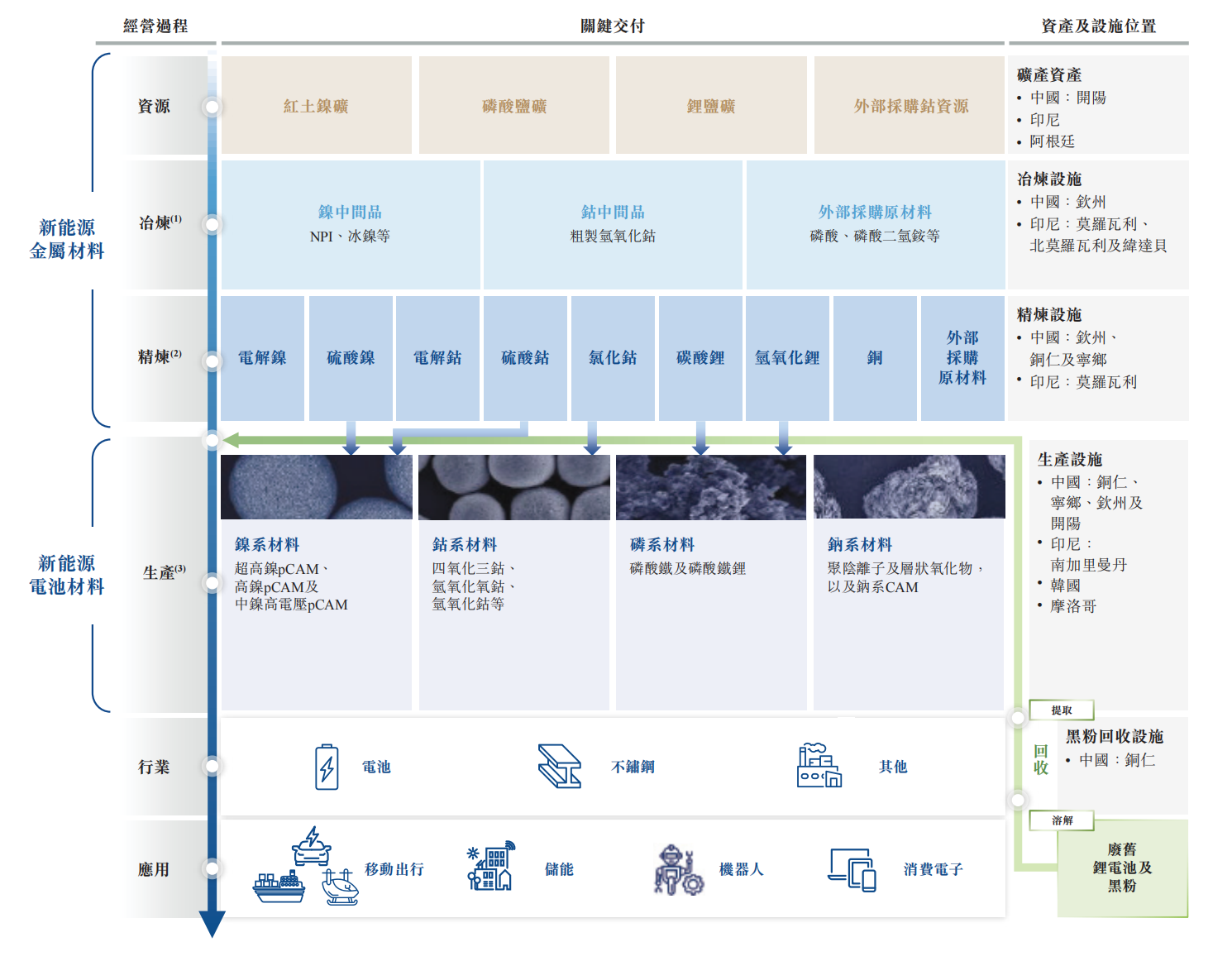 公司从新能源电池材料的研发起步,建立起了一套从上游新能源金属开采、冶炼和精炼,到新能源材料生产再到回收的一体化产业链条。在全球建设了十大产业基地,持续整合全球市场与资源,服务全球客户,成为全球知名的新能源材料龙头企业。