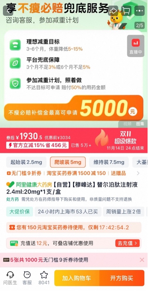 2025年3月底,美团率先推出了针对上述减肥药的“不瘦必赔”活动。在今年双11期间,各个平台都在针对减肥药进行类似活动,并将活动写在商品介绍图里。比如,阿里健康大药房称,患者购买替尔泊肽之后,若参加减重计划并照做,但未达到减重目标,最高可申请赔付50%的用药金额,最高可申请5000元。