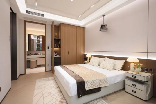 主卧采用洄游动线设计,实现了主卧与儿童房、老人房的联通。主卧展示的是中海睡眠解决方案,包括静音舱、零重力智能床、助眠模式、睡眠模式、起夜模式、唤醒模式等一系列场景,全维呵护高质量睡眠。中海还特别设计满足老人个性化睡眠需求的卧室,智能设置分床模式和合床模式,可通过小海同学发出指令,减少相互干扰。
