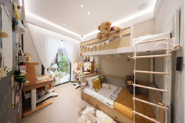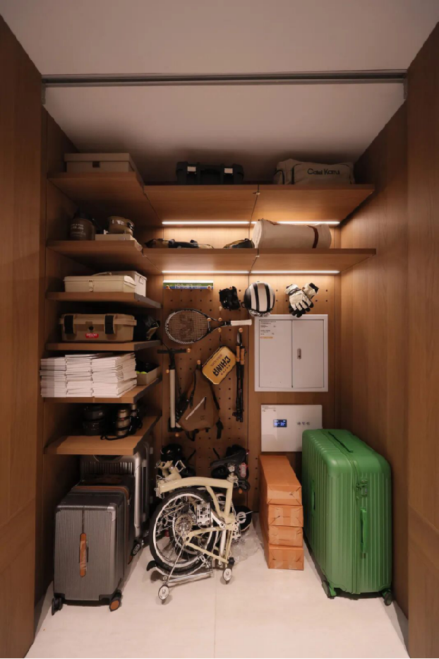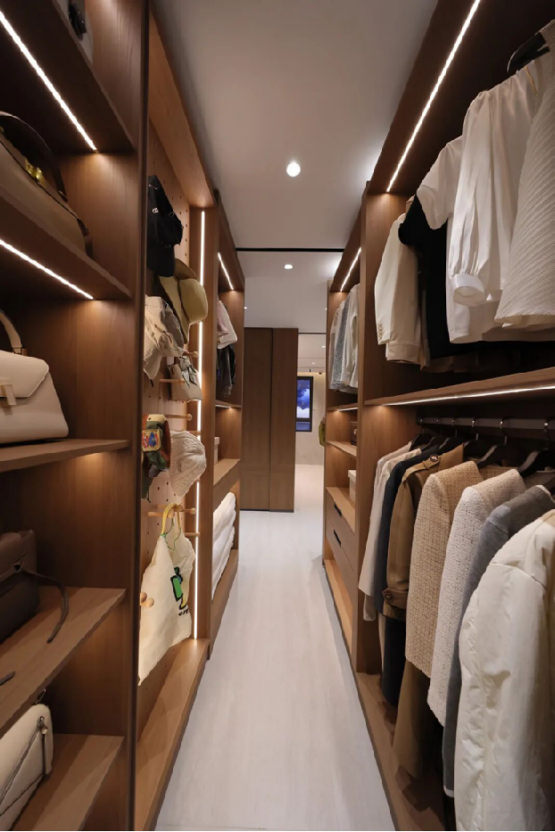 为解决换季衣物、被子等收纳问题,中海设计高功能性的可变衣帽间,合理安排叠放衣柜,节约空间、避免凌乱;同时解决贵重物品存放问题,让小海同学守护财物隐私与安全。