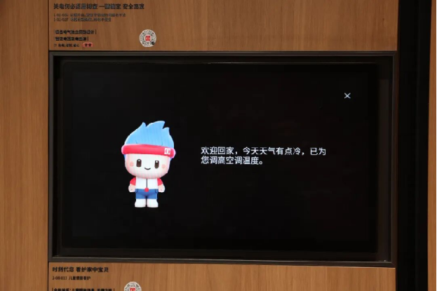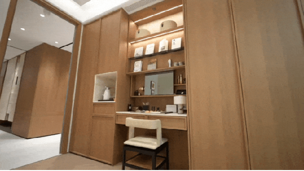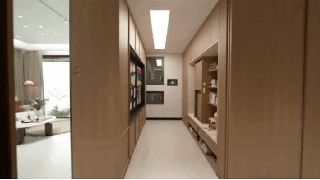 玄关,作为归家的起点,人因科技会自动感知人回家时的情绪、心率、呼吸率等指标,触发定制化的动作响应。这一切的实现,靠的是中海自研的智慧信息箱,它搭载了AI算力主机与大模型,端侧部署,本地化信息储存,保障用户隐私安全。玄关处15.6寸的中控屏,由中海自研,是行业最大的自产中控屏,首创BIM+IOT融合产品。同时,全屋的智能场景均支持由中海自研的语音助手-小海同学、手机APP-小海智家控制。