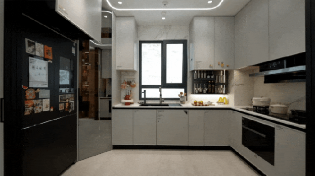 厨房采用了系列集成系统,大大提升了空间使用效率。集成洗净中心,让水槽下利用空间从不足20%提升到了85%;集成净饮中心,可以实现热水直饮,满足中国人爱喝热水的使用需求;集成烹饪中心,全面解决了用火安全、空间闷热、油烟串味等问题;电火灶设计,无需燃气也能实现大火炒菜,实现了居住建筑100%电气化。同时,厨房支持语言控制,解放双手,一键开启做饭模式。