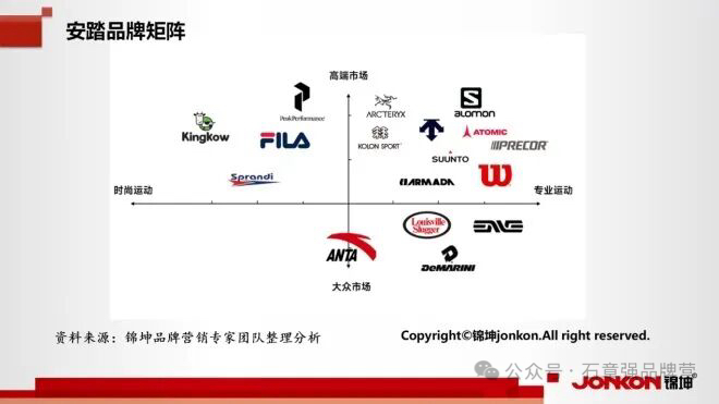 安踏体育的品牌分布策略明确,通过1+2+3战略,即“单聚焦+多品牌+全渠道”,深化细分市场的领导地位。“单聚焦”是指把自己的产品放在首位,用认真极致的工匠精神打造出最好的产品。“多品牌”是指丰富产品内容,争取做到大众消费者到高端消费者都能在安踏集团找到自己想要的产品。“全渠道”是指通过各种形式覆盖消费者,线上线下结合,在街铺、商场、百货公司、网店以及各电商平台进行产品的全面覆盖。安踏通过强化多品牌矩阵,覆盖不同细分市场,实现业务增长。