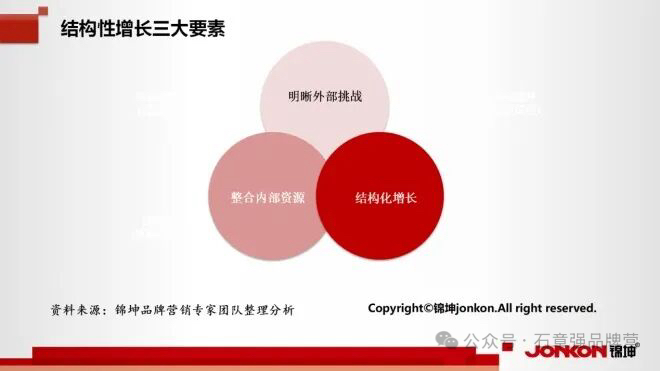在十亿品牌成长为百亿品牌的过程中,企业面临的挑战不仅限于单一的内生性增长和品牌基因深耕。结构化增长的策略同样至关重要,这涉及到对外部挑战的清晰识别与应对,同时通过有效整合内部资源来推动企业的全面发展。结构化增长的核心在于系统化的战略规划和资源优化,确保企业在动态市场环境中能够灵活应对各种复杂情况,并实现长期的稳定增长。