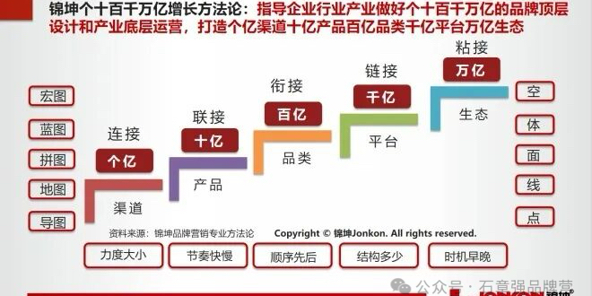 作为锦坤品牌创始人和资深品牌营销专家,石章强提出,企业只要找对了不同阶段更高阶段的成长和开拓逻辑,通过个亿-点-导图、十亿-线-地图、百亿-面-拼图、千亿-体-蓝图和万亿-空-宏图就可以相继从个亿奔向十亿、冲向百亿、跃向千亿甚至迈向万亿!