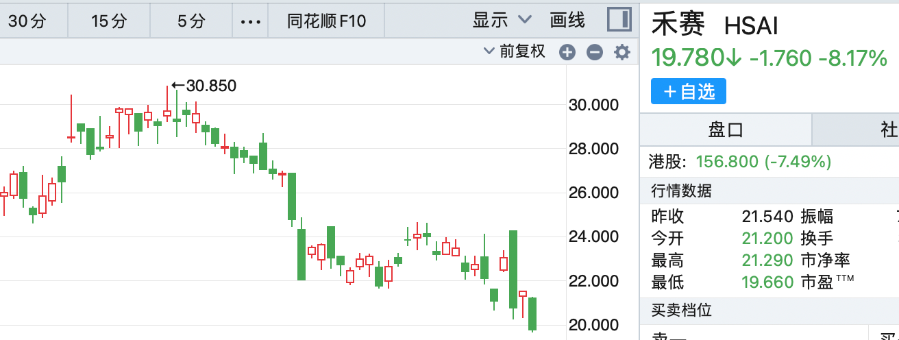 与研报发布同步,禾赛美股股价在两个月内从10月初的30.85美元已持续回落至最新的19.78美元,跌幅超过三成,距离目标价的28美元也差距较大,市场对其成本结构与竞争格局的担忧快速升温。