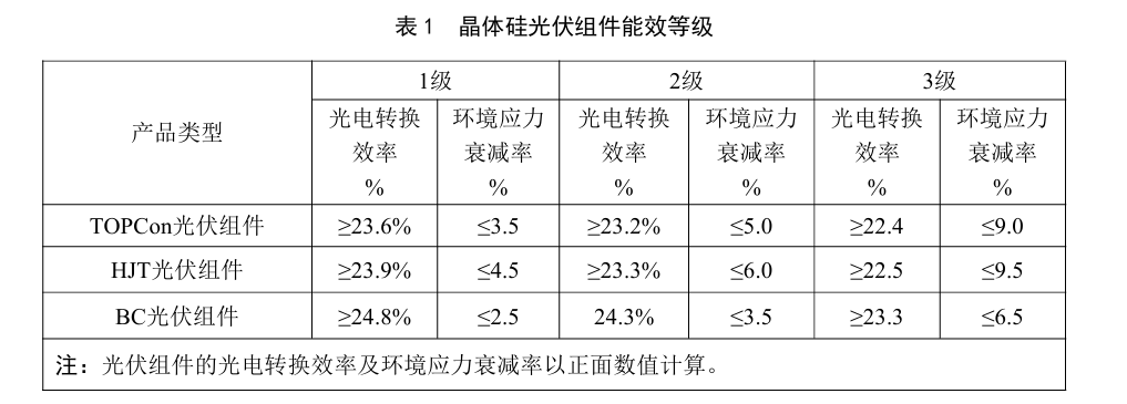 今年9月11日,国家市场监督管理总局、国家标准化管理委员会发布《晶硅光伏组件和逆变器能效限定值及能效等级(征求意见稿)》,其中规定拟将光伏组件按照技术路线分为TOPCon(隧穿氧化层钝化接触电池)、BC(背接触电池)和HJT(异质结电池)三类,每类又划分三个等级,区分等级的参数主要是光电转换效率(决定功率的参数)。