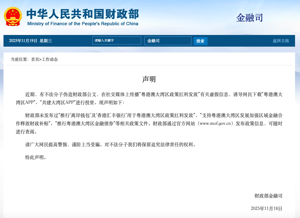 经济观察网 财政部金融司11月18日发布声明称,近期,有不法分子伪造财政部公文,在社交媒体上传播“粤港澳大湾区政策红利发放”有关虚假信息,诱导网民下载“粤港澳大湾区APP”、“共建大湾区APP”进行投资。现声明如下: