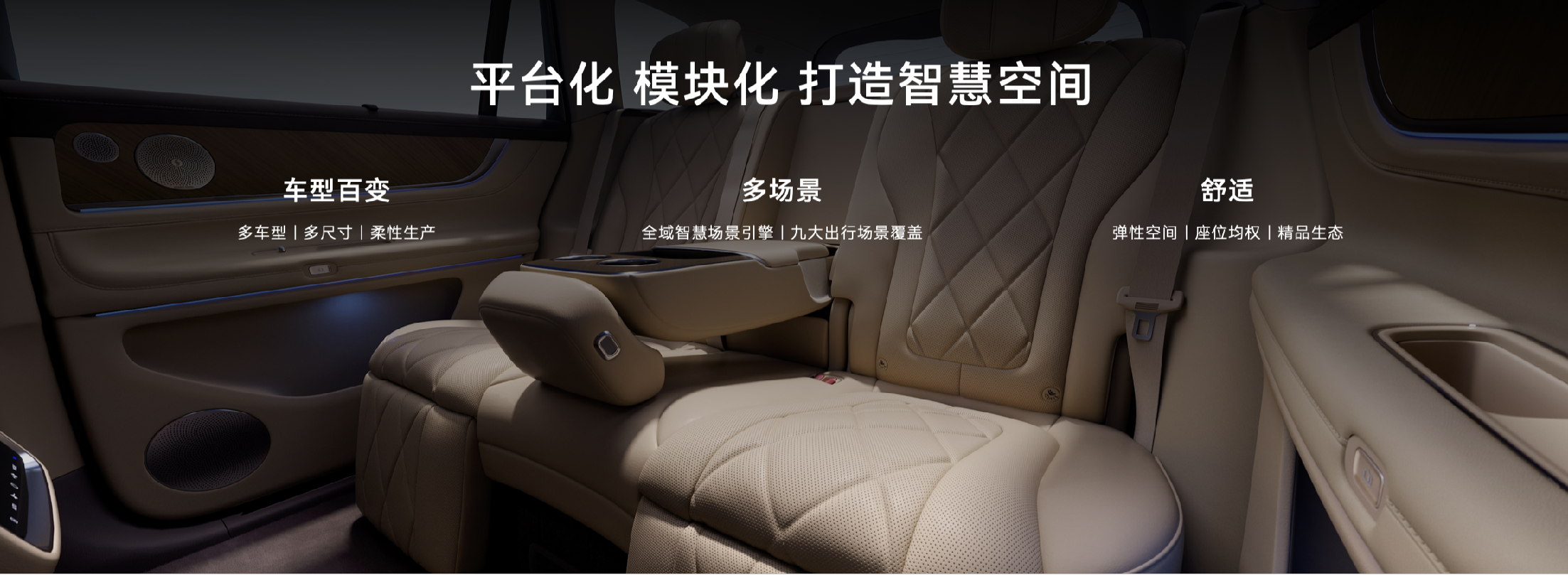 在智慧空间方面,通过平台化、模块化设计,实现了一个平台支持多车型(轿车、SUV、MPV、越野等)、多尺寸(B-D级)和柔性生产。增加对主动悬架、线控后转、线控底盘、多电机的支持,让空间布局更加灵活;依托全域智慧场景引擎,覆盖通勤、休憩、户外等九大出行场景,无论是家庭出行还是商务接待,车内空间都能弹性扩展,随心而变。