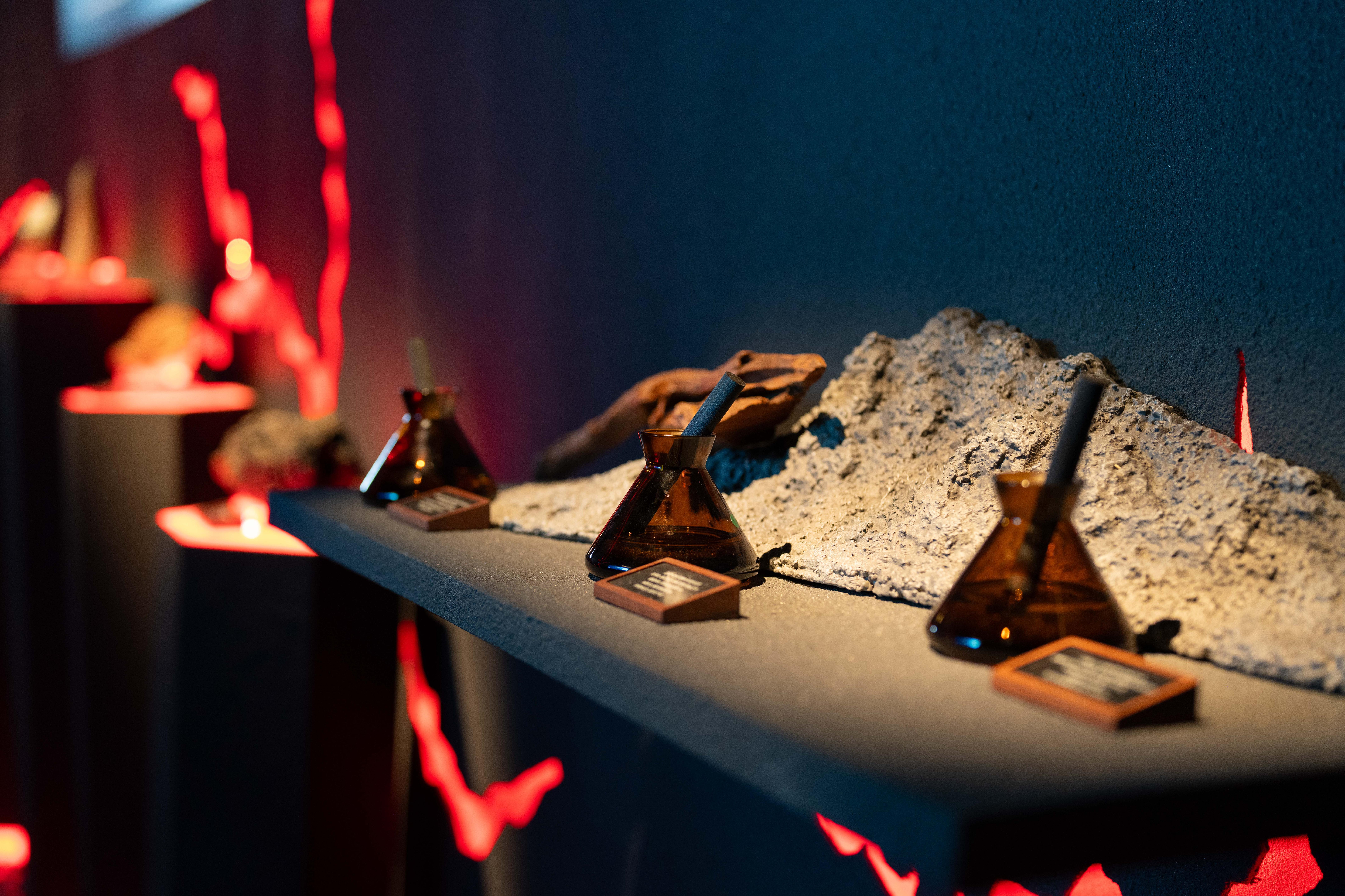 该“自然「柏」物馆”被岩壁造型的装置所包围,并通过墙面设计的红色裂痕营造出火山岩浆的视觉意象,结合所陈列的自然符号,共同构建出一个模拟火山环境的展示空间。品牌希望通过这些设计,在引导参与者感受真实自然的同时,也传递出对自然的敬畏之心。
