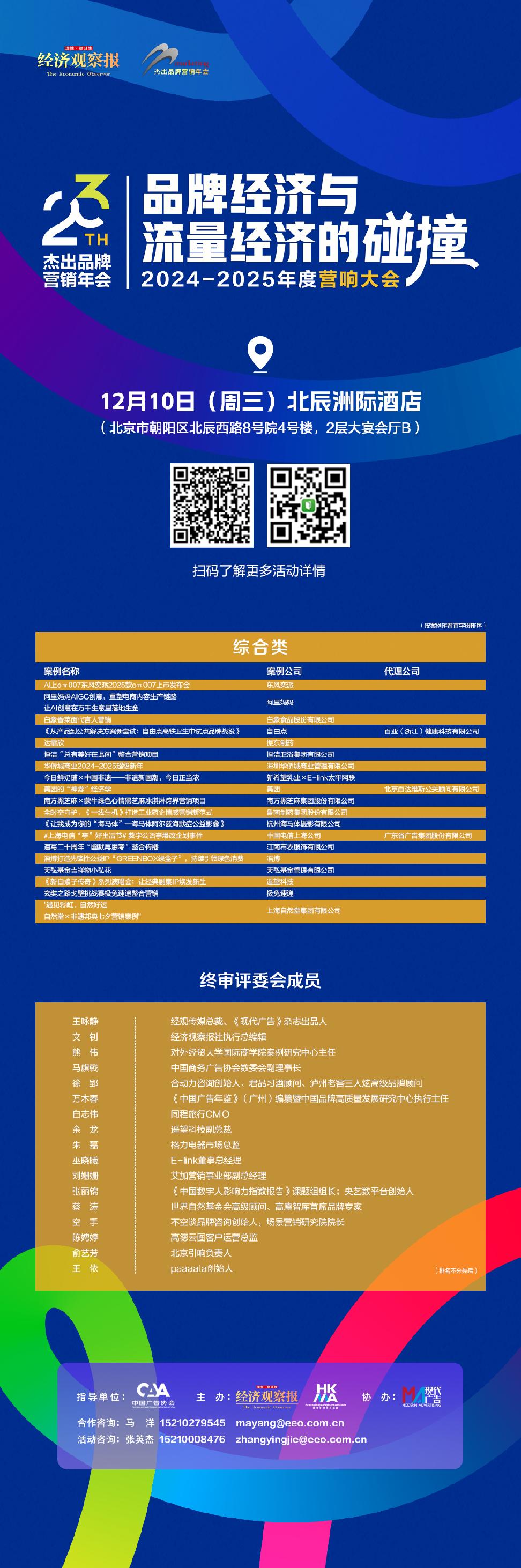 12月10日,由《经济观察报》与香港管理专业协会联合主办、中国广告协会指导的“2024-2025年度营响大会暨第二十三届杰出品牌营销年会”将在北京北辰洲际酒店举行。