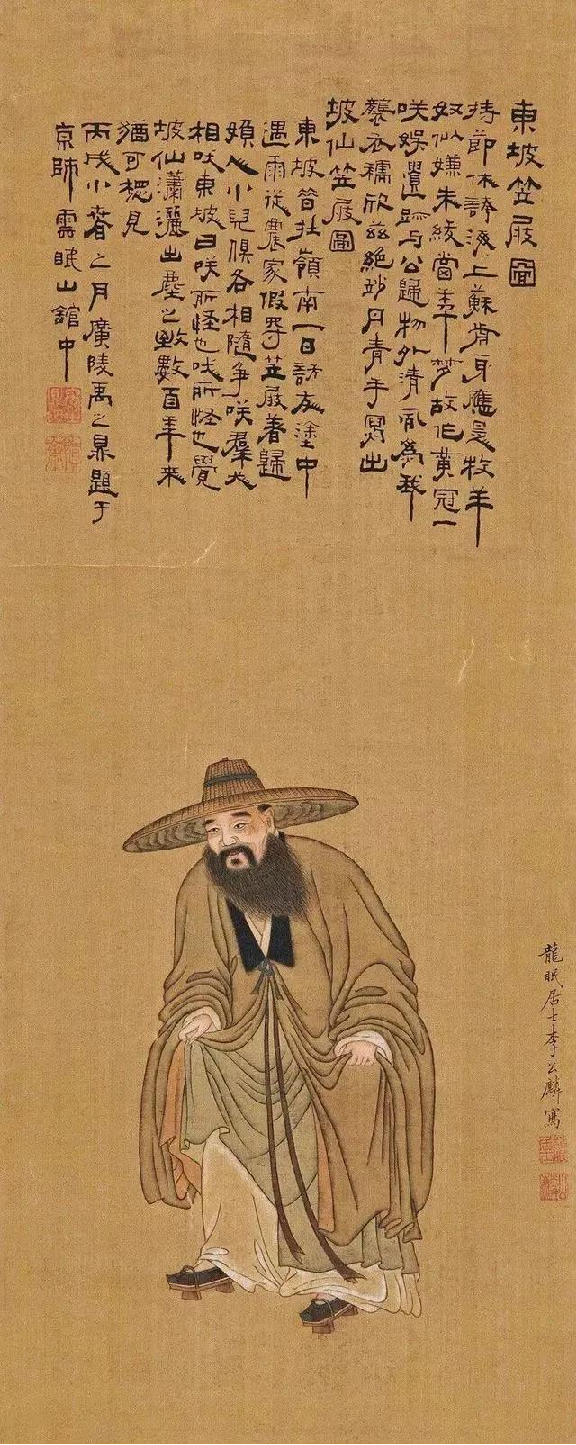 自宋代以来,“东坡笠屐”就成为画家们津津乐道的绘画题材。李公麟为苏轼好友,在《东坡笠屐图》题跋处他写道:“东坡一日谒黎子云,途中值雨,乃于农家假篛笠木屐戴履而归。妇人小儿相随争笑,邑犬争吠。东坡曰:‘笑所怪也,吠所怪也。”苏轼访黎子云遇雨,在农家借篛笠木屐,大概是穿得很奇怪,因此大家笑话他。苏轼本人在《访黎子云》一诗中还写道:“东行策杖寻黎老,打狗惊鸡似病风。”说拿竹杖向东走找黎子云,惊得鸡狗像得了疯病似的,也因此“东坡笠屐”有时也会表现竹杖。苏轼的“竹杖芒鞋轻胜马”本就是他的著名词句,苏轼的其他画像中也多有竹杖。
