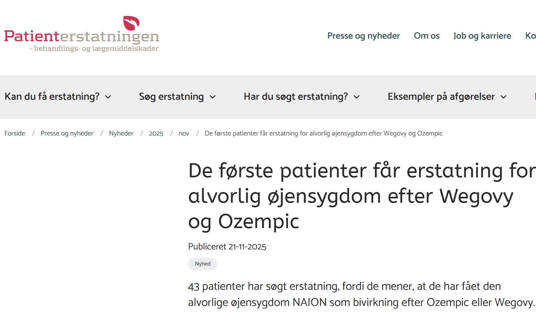 当地时间11月21日,丹麦患者赔偿协会官网发布信息称,43名患者在使用Ozempic(中国注册名“诺和泰”)或Wegovy(中国注册名“诺和盈”)后,出现了严重的眼部疾病NAION(非动脉性前部缺血性视神经病变),患者赔偿协会现已对首批5起案件作出裁决,其中4起案件均获赔偿,另一起案件被驳回。