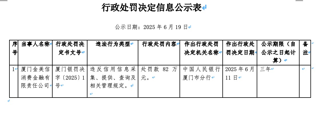 12月1日,国家金融监督管理总局厦门监管局公布的一纸行政处罚信息公开表,再次将厦门金美信消费金融有限责任公司(下文简称“金美信消费金融”)推向监管聚光灯下。罚单(编号:2025-3)显示,金美信消费金融及相关责任人员因第三方合作机构管理不到位、消费者权益保护工作不到位、个人消费贷款业务调查审查不审慎等主要违法违规行为,被厦门监管局处以对公司罚款120万元,并对两名相关责任人员庄雅兰、周忠德给予警告的行政处罚。