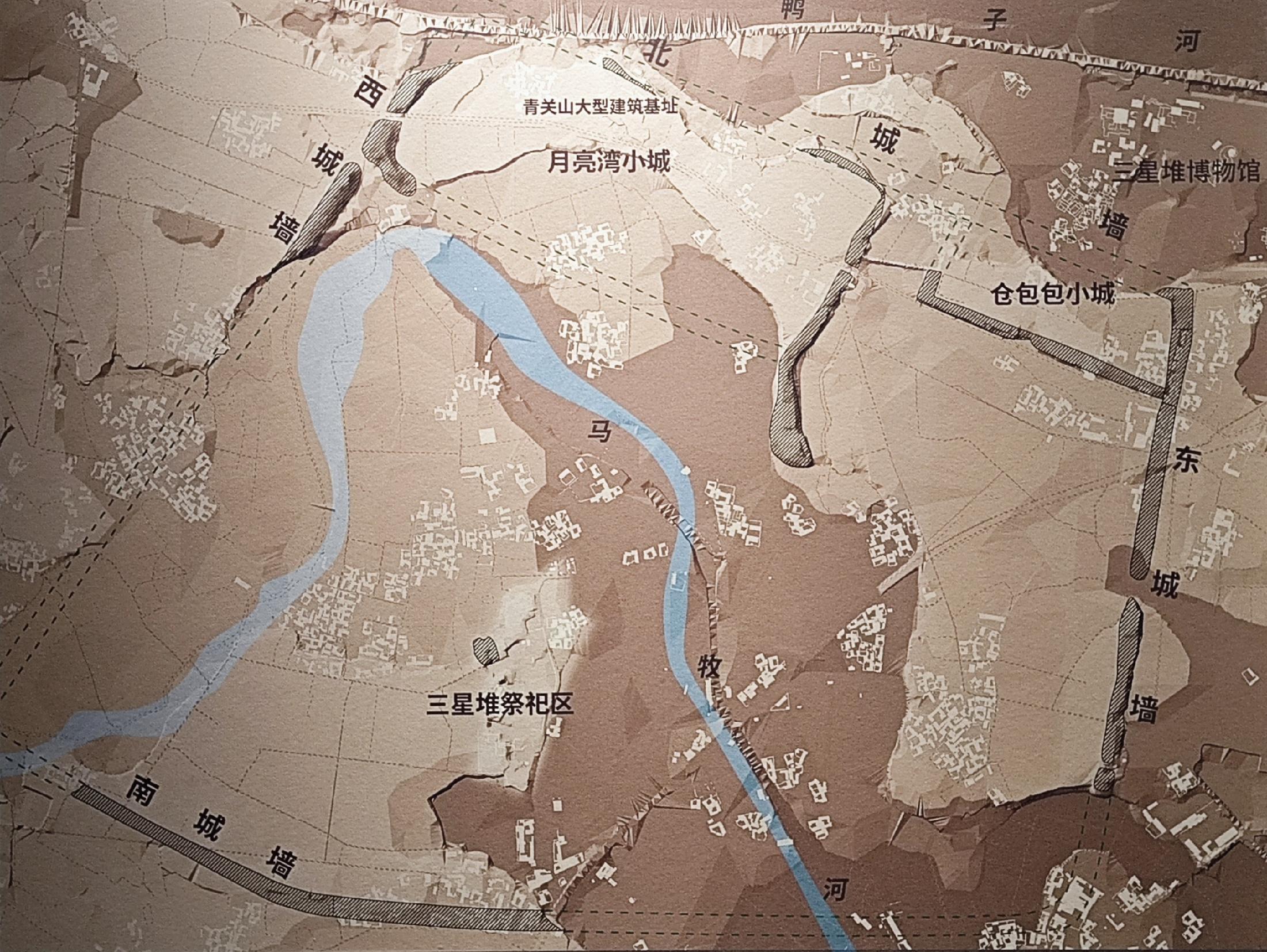 鸭子河南岸,分布着面积约12平方公里三星堆遗址(据现有认识),集古文化、古城、古国遗址的考古面貌于一址。