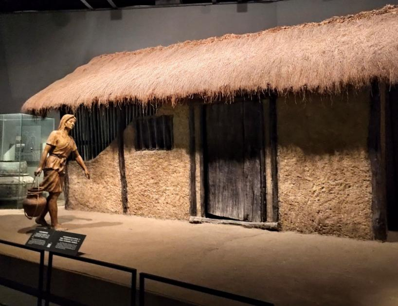 他们采用“木骨泥墙”的方式修起住房——平整地表,挖掘基槽后,用圆木竖搭成房屋骨架,再横向嵌入竹条,编好加固,再糊上抹草拌泥,形成墙体后,最后在屋顶铺上稻草。