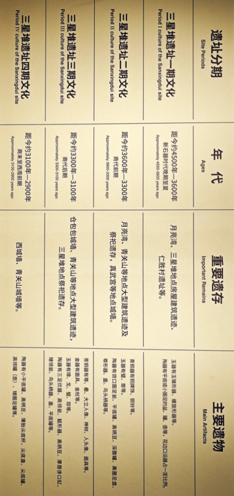 整个三星堆遗址,跨越石器、青铜两个大时代。考古人依据碳素测年以及与其他文化器物类型的比较,将其主体年代范围界定在新石器时代晚期延续至西周早期。上限年代的追溯,有距今4800、4500年两种说法;下限有距今3000年、2600年两种说法。