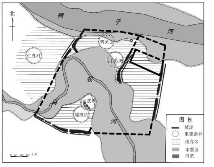 大约在公元前2500年,距今4500年时,先民们开始在此定居、汇聚,在鸭子河与马牧河两河间的润泽地带活动,即遗址的上半部分区域。