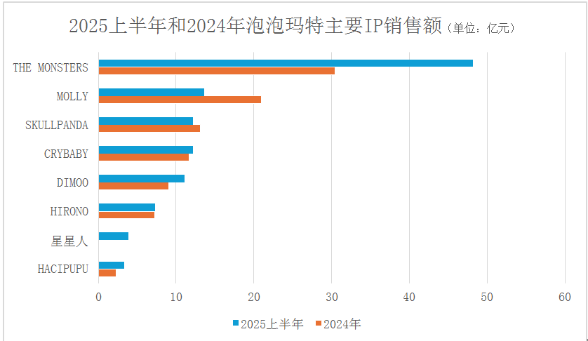 需求的相互依赖性,不仅体现在同款IP,还能带动公司旗下其他主要IP销量增涨。多款IP2025年上半年的销售额超过去年全年,前5大IP的年销售额均超过10亿元,加起来的销售占比超过70%。其中,LABUBU同期销售额为48.1亿元,在公司销售总额的占比超过三分之一。