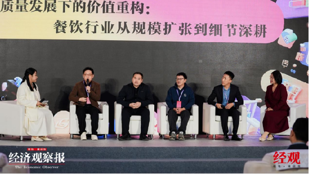论坛上,经济观察报大消费新闻二部主任郑淯心作为圆桌会议主持人,与熊喵来了联合创始人李小孬、广顺兴品牌合伙人李振川、小吊梨汤品牌官刘正、夸父炸串品牌副总裁曲桐以及快消行业公关专家巧姐(梁玉巧)共同围绕“高质量发展下的价值重构:餐饮行业从规模扩张到细节深耕”这一主题展开深入探讨。