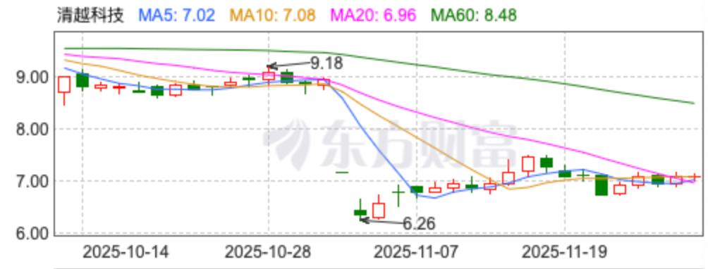 股价走势清晰反映了市场对风险的定价。10月31日(三季报披露后首个交易日),清越科技收于8.94元。11月1日立案公告发布后,股价开启下行通道。至12月5日,收盘价为6.84元,累计下跌2.10元,跌幅23.5%。同期科创板整体表现平稳,凸显投资者对公司特有风险的高度敏感。即便11月4日提出回购建议,也未能有效遏制抛压,反映出市场对缺乏实质进展的“信心喊话”持怀疑态度。