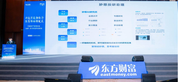 (图为演讲嘉宾:东方财富首席科学家、AI总监曹巍介绍妙想金融大模型)