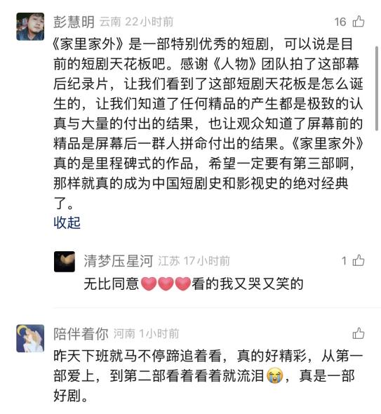 伴随剧集的推出,《家里家外2》幕后创作纪录片也在《人物》上线,镜头记录下片场里外整个团队对创作的投入与专注,30天的拍摄周期再次创下竖屏短剧的拍摄时长纪录。