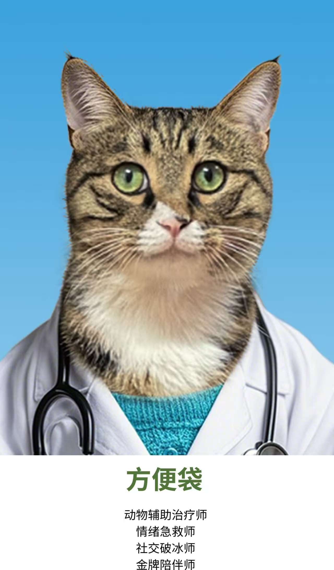 在济南智善心理医院(下称“智善心理”),“医疗专家团”介绍栏的首位是一张穿着白大褂的狸花猫照片。这只名为“方便袋”的猫,被称作“方医生”,头衔是动物辅助治疗师、情绪急救师、社交破冰师和金牌陪伴师。院长、资深咨询师的介绍排在其后。