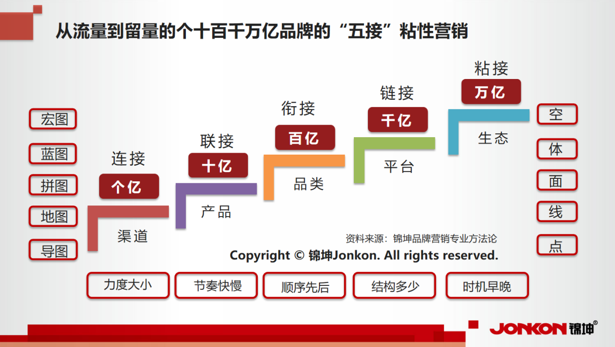 正如在他最新出版的畅销书《百亿品牌:企业营收从十亿到百亿的“拼图”战略》中所呈现的那样,每个阶段都需要不同的连接策略,个亿-点-渠道要连接得上,十亿-线-产品要联接得多,百亿-面-品类要衔接得好,千亿-体-平台要链接得紧,万亿-空-生态要粘接得牢,需要量体裁衣而非盲目跟风,才能步步为营步步赢。