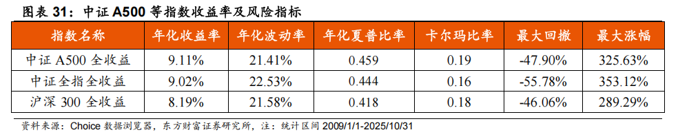 收益表现来看,中证A500指数历史业绩优异,牛市行情较沪深300具备更高上涨弹性,熊市行情中则有抗跌性,长期年化收益率表现出色,跑赢部分宽基指数。Choice数据统计显示,自2009年11月1日至2025年10月31日,中证A500全收益年化收益率9.11%,最大涨幅325.63%,均优于同期沪深300,最大回撤与沪深300指数相当。