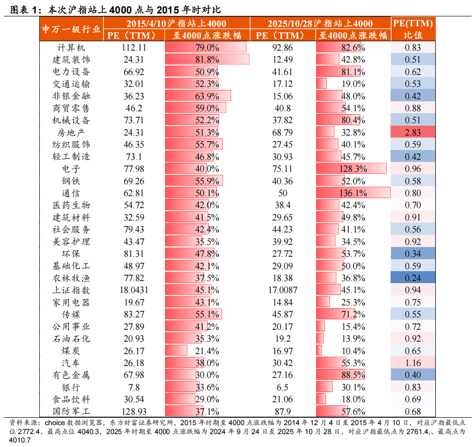 研报认为,本轮牛市与前两轮显著不同。首先,本轮牛市自2024年9月24日启动至首次突破4000点用时超1年,相比前两轮用时更长,是健康的震荡慢牛;其次,推动本轮行情突破的最重要力量来自以信息技术为代表的新质生产力,如电子、通信、计算机、电力设备等成为引领本轮牛市涨幅的主力军;最后,本轮市场整体以及各个行业估值水平大多显著低于上一轮4000点水平,根本原因是当前中国经济质效跃升和A股市场生态重塑。