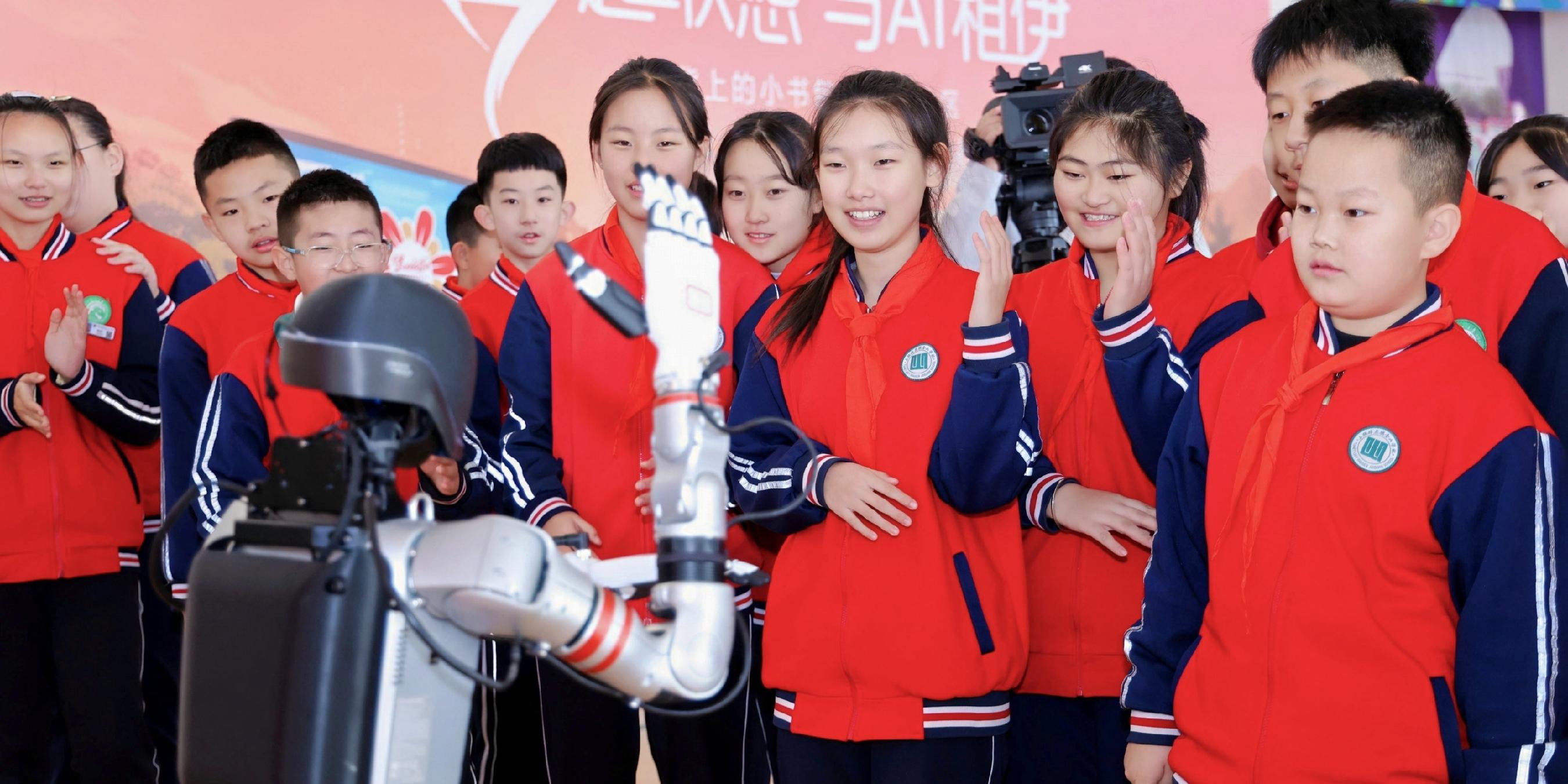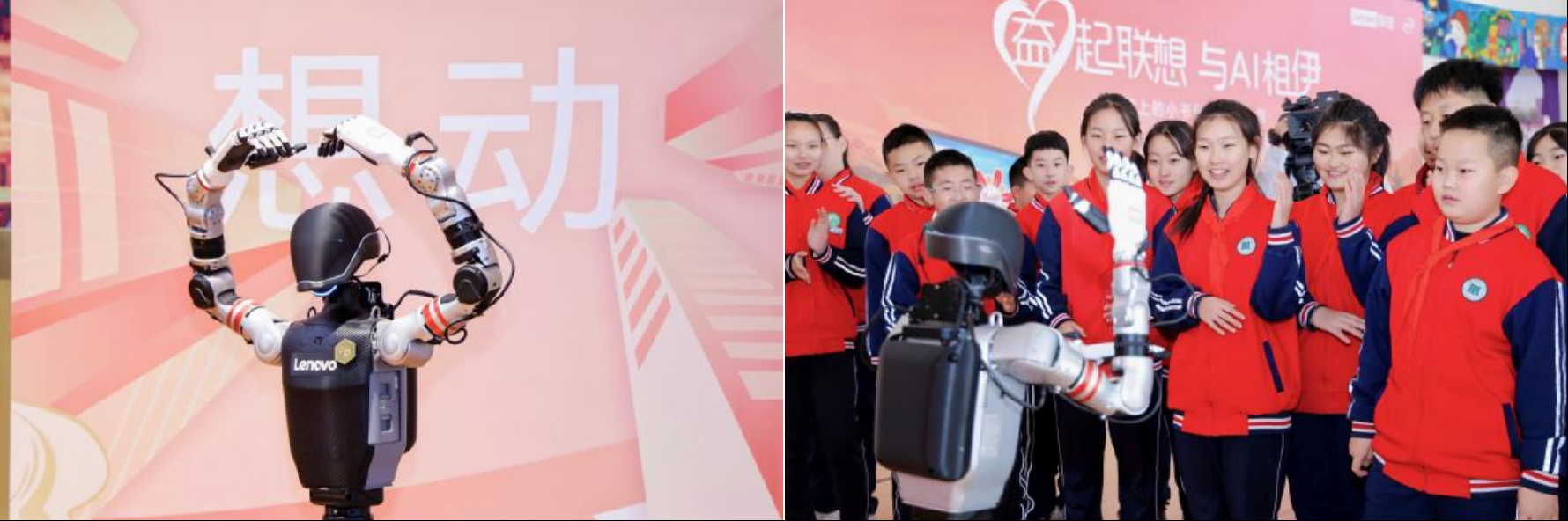最先亮相的是联想首位硅基员工“乐享壹号”。它不但参与了捐赠仪式,还带着孩子们一起打起了太极,孩子们瞬间围拢过来,迫不及待地和它问答、互动。