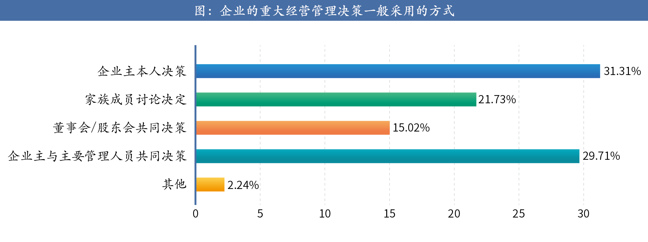本次受访家族企业中,由企业主本人决策的占比31.31%;由家族成员讨论决定的占比21.73%;由董事会/股东会共同决策的占比15.02%;由企业主与主要管理人员共同决策的占比29.71%。