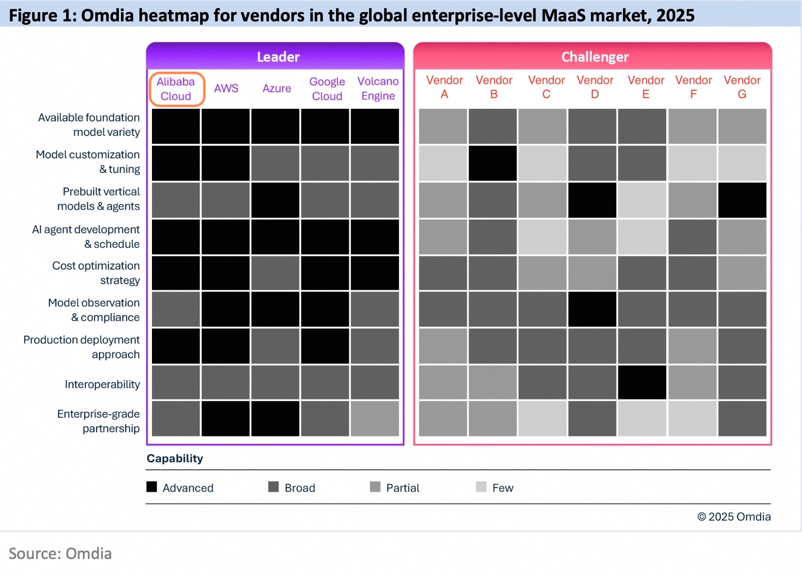 图说:《2025年全球企业级MaaS市场分析》报告显示,阿里云获评全球领导者,在5大维度上获评“领先”级别。