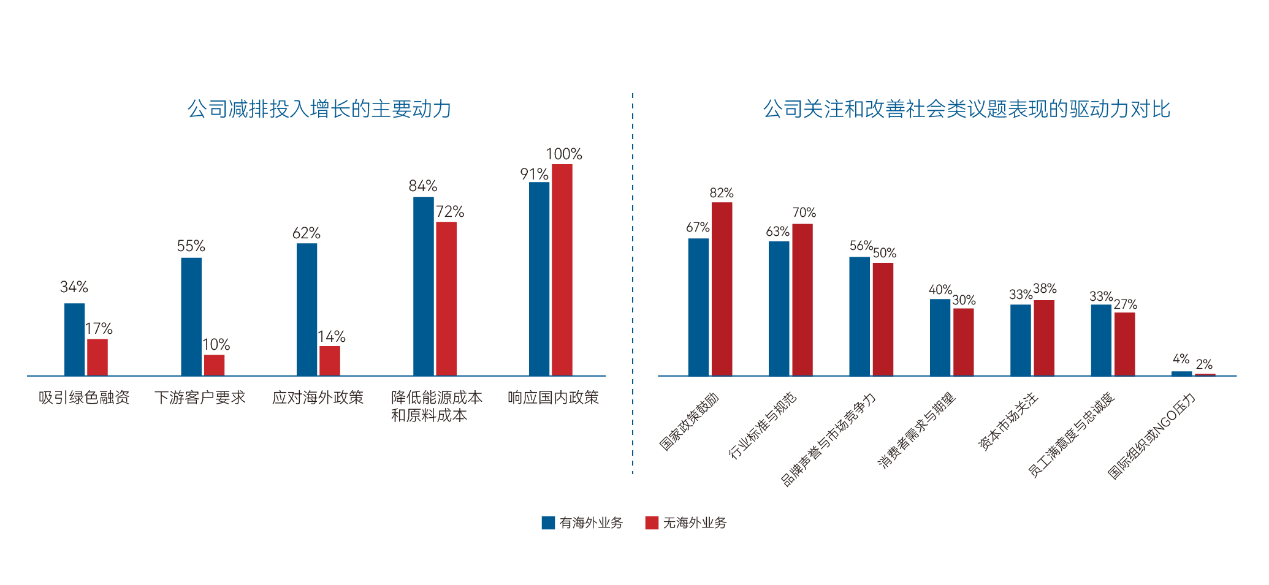 值得注意的是,出海正在成为倒逼中国企业提升ESG表现的强大引擎。调研揭示,拥有海外业务的企业在改善ESG表现上受到更强的市场化驱动:它们因“下游客户要求”而增加减排投入的比例(55%)显著高于无海外业务的企业(10%);同时,因“消费者需求和期望”(40%)而改善社会议题表现的驱动力也高于无海外业务的企业(30%)。