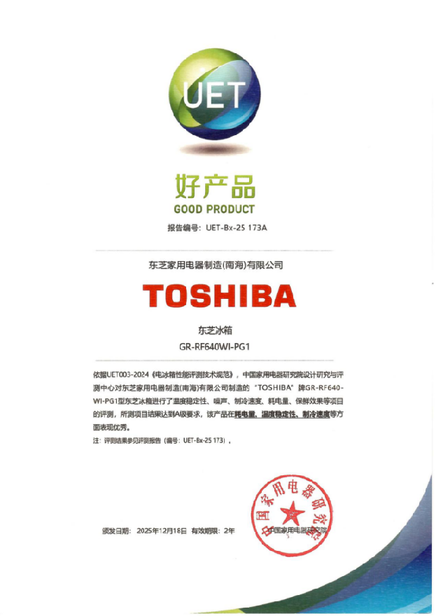 凭借耗电量、温度稳定性、制冷速度等方面的性能表现,东芝大白梨系列新品还获得了由权威机构中国家用电器研究研颁发的“好产品”认证。