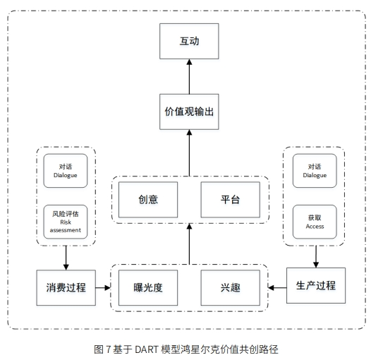 鸿星尔克与消费者价值共创的路径是:基于曝光度与消费者对原有圈层文化的兴趣,为消费者提供创意生产的平台,并使消费者的输出成为消费者对品牌的接触点,品牌与消费者进行深度的沟通与积极的互动,开展品牌与消费者的对话,最终实现生产与消费过程中的价值共创,如图 7 所示。