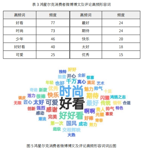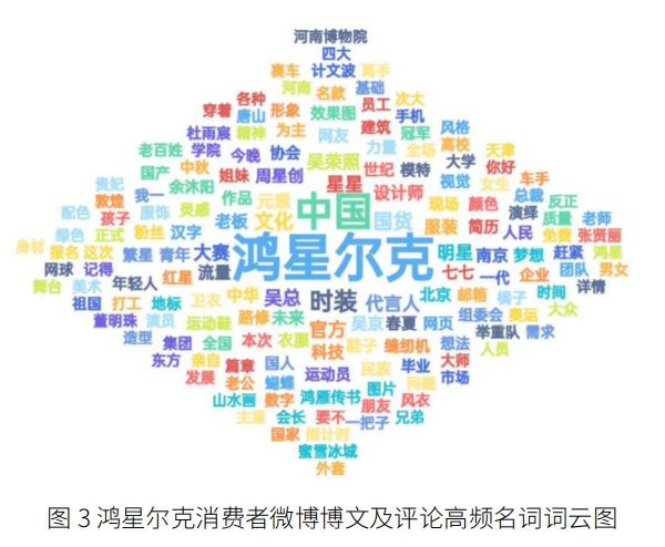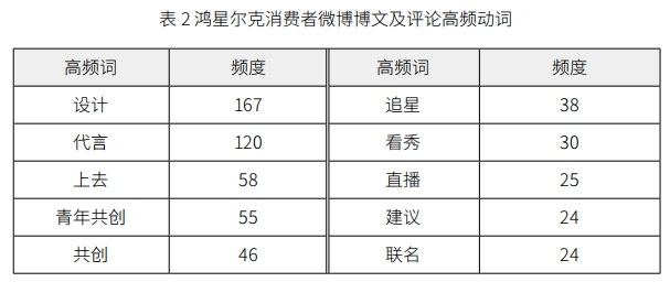 从高频词名词可见(见表 1),“鸿星尔克”“中国”是消费者在博文中提及度最高的词汇,可见消费者在发表言论时将鸿星尔克作为主要主题进行讨论,“中国”的词频数仅次于“鸿星尔克”,“国货”的词频数也高达 99,鸿星尔克“国货”形象显著。“吴总”“代言人”“吴荣照”也是提及度较高的词汇,主要反映了众多网友为鸿星尔克提出的建议和想法。比如网友希望鸿星尔克让吴荣照本人作为鸿星尔克的代言人,所提及的“吴京”,也是网友所推举的“代言人”之一。例如“别找代言,自己代言,要找只能找吴京”“吴总就是最好的代言人,比任何流量明星都合适。”“最多找吴京!一把子支持!!”从高频词动词可见,“设计”“代言”“上去”的词频数最高,体现的是网友对鸿星尔克在设计、代言等方面所提及的建议,并且希望相应的想法“上去”让品牌方可以看见。例如“在设计上可以多加些中国元素”“蜜雪冰城联名火速搞起!!赶紧趁现在连夜设计!!卖爆啊哥!!!”“期待到时候穿你设计的鞋子哈哈哈”“# 鸿星尔克青年共创计划 # 设计一款联名球鞋 @ 河南博物院”。从高频形容词“好看”“时尚”“好好看”“可爱”“期待”等词汇也可以看出消费者对网友提出的某些建议和想法的喜爱。例如“上去上去!支持原创 ~ 支持国货!这 ip 太可爱了啊!!”“哇好可爱上去吧你”。从以上词频可见,消费者可以通过话题讨论等方式“获取”品牌的相关信息,并且与品牌进行紧密的“对话”。