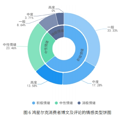 利用 ROST CM 6.0 对消费者在新浪微博发表的博文和评论进行情感分析(见表 4),为了更直观呈现,将情感分析的强度进行可视化处理,绘制饼图(见图 6)。分析结果显示积极情绪占比为 64.2%,中性情绪占比为 23.46%,消极情绪占比为 12.35%。从高频词的分析结果来看,消费者在新浪微博中发表的言论也是以积极正面的词汇为主,由此可见,网友对鸿星尔克共创的态度是正面的,也非常乐意加入鸿星尔克“共创”的狂欢中。