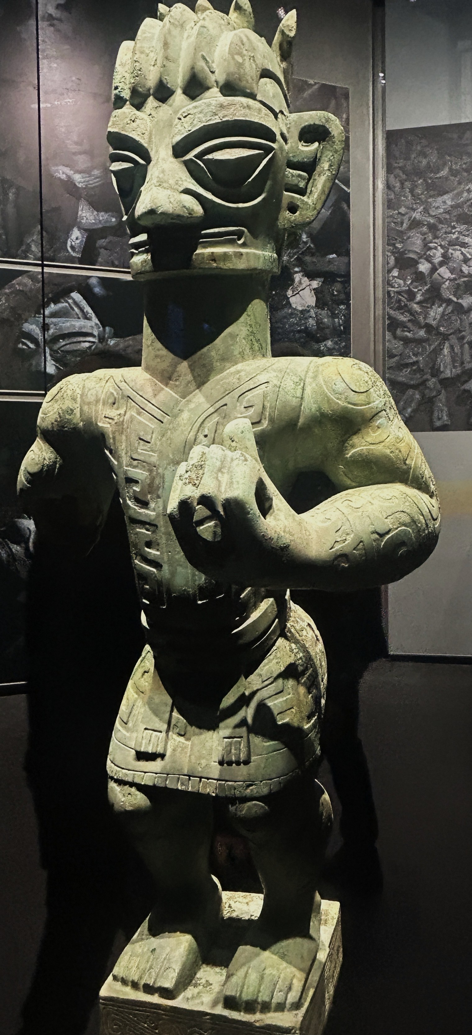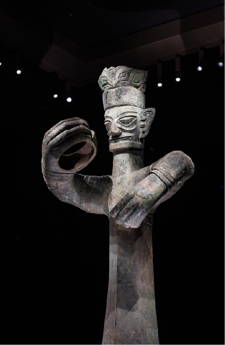文博时空 作者 毛玉婷 黄河流域的青铜礼器用陈列组合的方式,创造出以鼎簋为代表的符号系统,服务于社会秩序,内敛、规范;三星堆则用一种更为外放的青铜器组合,传达出一种超现实想象,其中,人物造像的艺术表达堪称一绝。