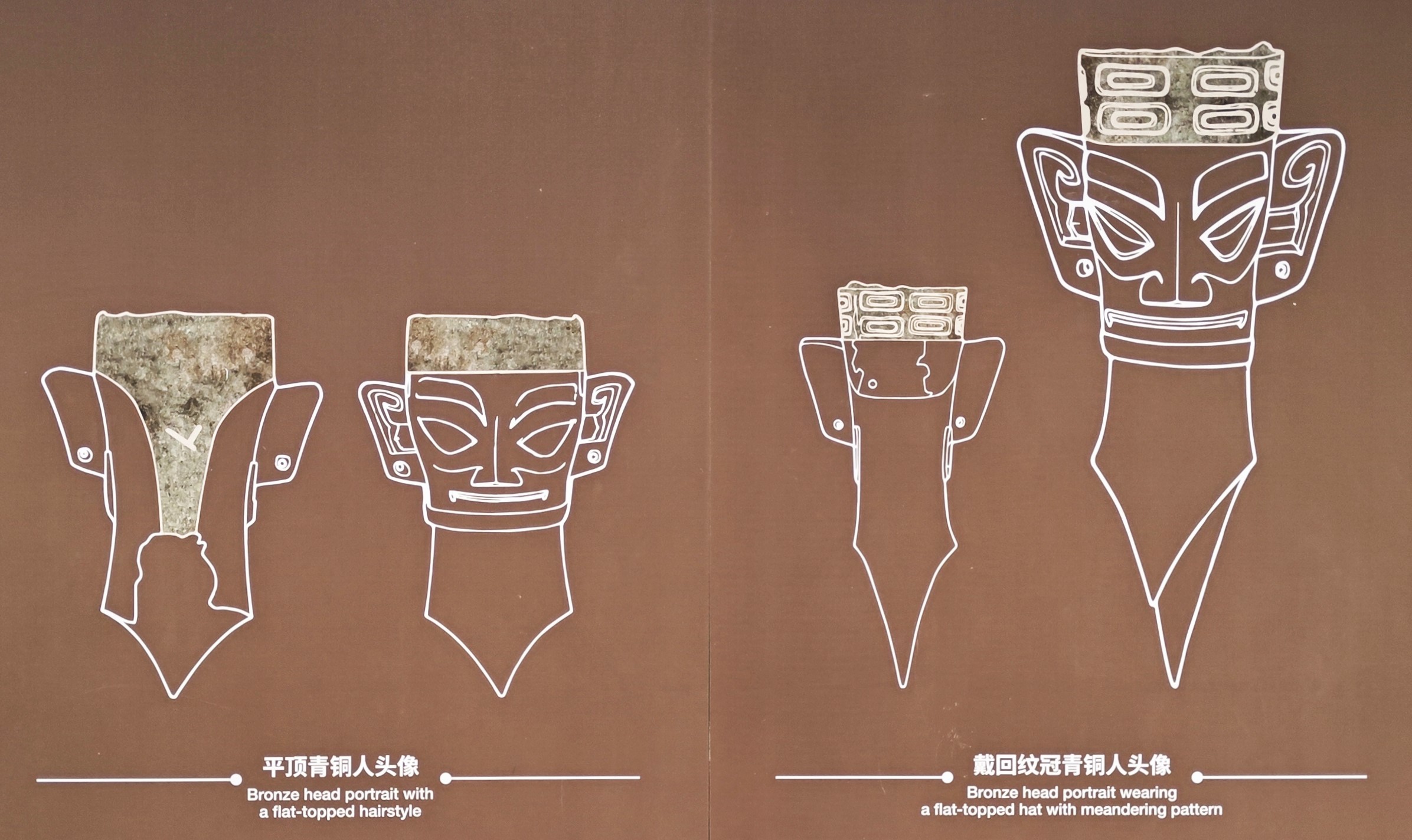 他认为,当时可能有众多地区和民族的人们前来参加,共同构成了一个神圣的三星堆祭祀中心,数量最多的“平顶冠独辫式人头像”,可能代表三星堆神权古国时期的主体人群。其中有几个身份更为特殊的高贵者,还在面部装上了黄金的面具。