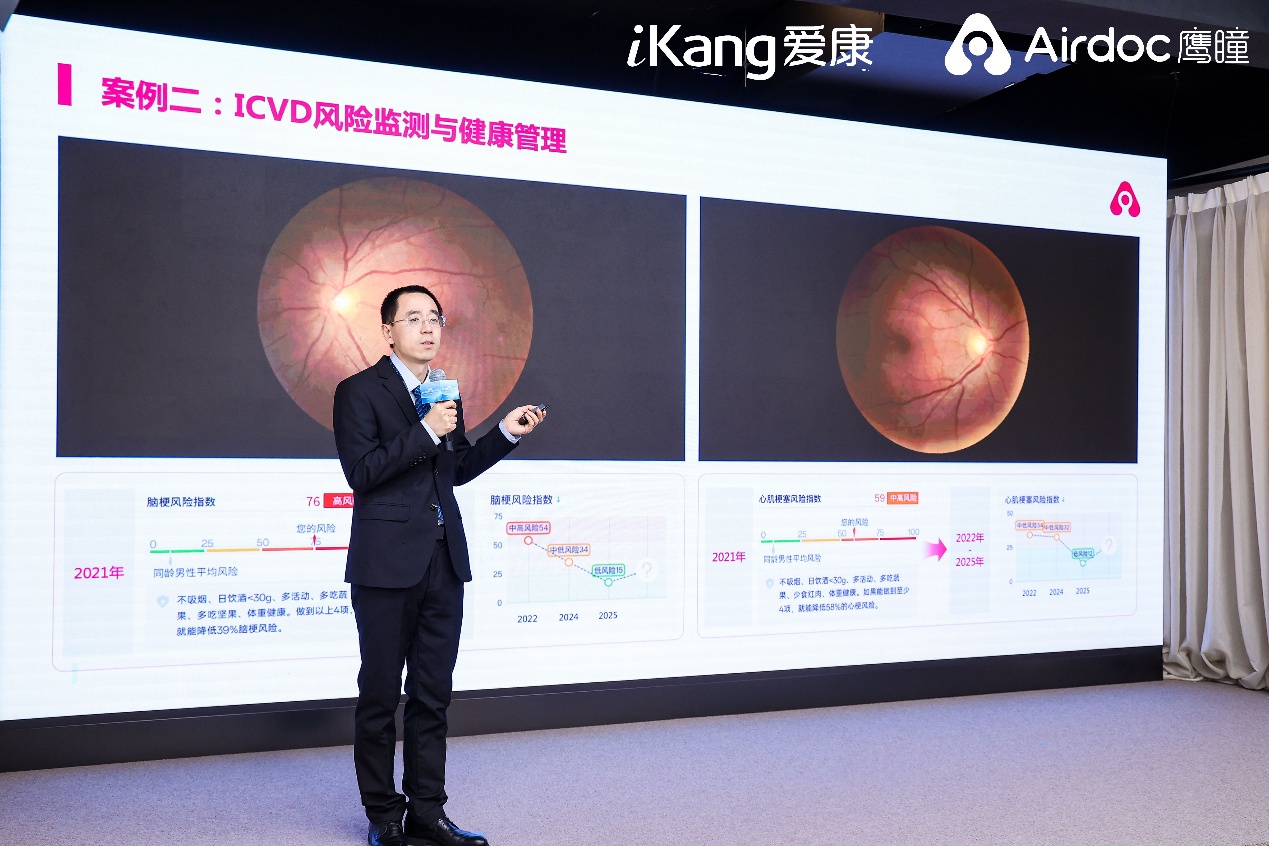 鹰瞳科技董事长张大磊分享道:“我们从2019年开始联手持续发布《体检人群健康蓝皮书》,就是希望做好科普,让每一个人都知道定期监测自己的血管神经健康状态,定期体检,发现问题之后第一时间处理。我们在持续监测视网膜的基础上,也研发了控制儿童青少年近视发展的PBM(光生物调节)产品,希望可以和爱康一起服务更多人。”