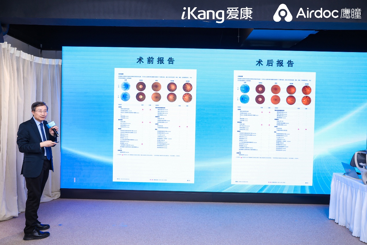 此外,现场特别设置了患者分享和专家解读环节。连续多年在爱康进行体检的谭先生因在最近一次体检中增加了视网膜人工智能健康评估项目,在无症状情况下发现了致盲性眼病“青光眼”,继而在爱康医护的建议下及时前往医院进一步确诊并接受了手术治疗,避免了失明悲剧。谭先生的亲身经历正体现了定期进行眼底检查,以及早筛查、早诊断、早治疗的重要意义。
