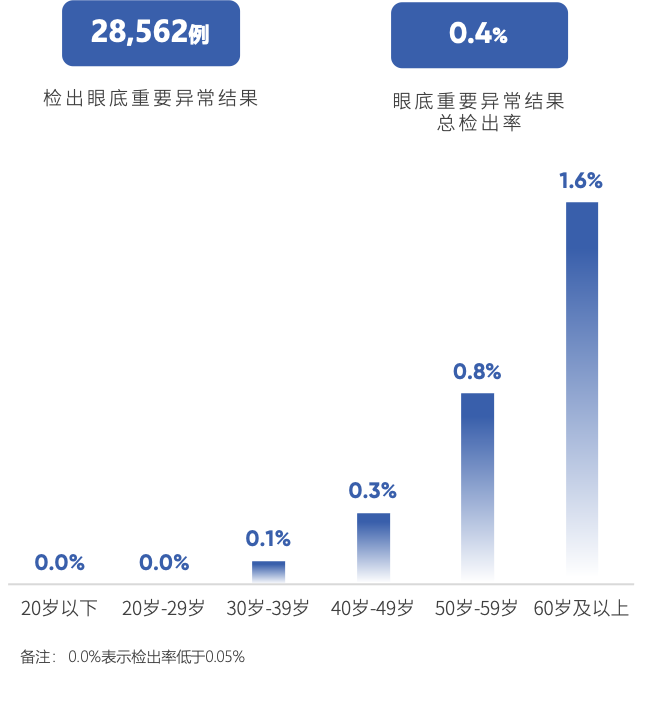 在眼底重要异常结果方面,即发生于视网膜的严重异常需要立即到医院确诊或排除可能引起严重视力损伤的病变,累计发现28,562例,检出率为0.4%,有效预警了失明风险。