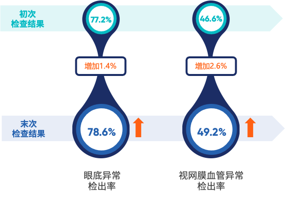 在超100万连续进行视网膜人工智能评估的人群中,末次检查结果的眼底异常总检出率较初次增加了1.4%,其中,视网膜血管异常检出率的增加最多,为2.6%。
