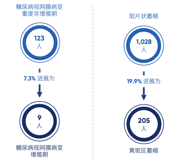 连续进行眼底“年检”有助于及时发现眼底异常的进展,《蓝皮书》显示,初次检查发现糖尿病视网膜病变重度非增殖期的体检者,有7.3%在末次检查时进展为增殖期;初次检查发现斑片状萎缩的体检者,有19.9%在末次进展为黄斑区萎缩,这两项眼底异常均较2024版《蓝皮书》进展明显加快,需要引起重视。