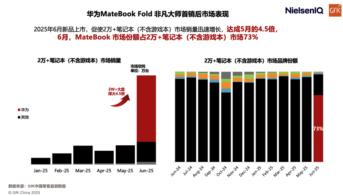 今年5月,华为正式推出搭载HarmonyOS的PC产品——华为MateBook Fold 非凡大师与华为MateBook Pro,宣告鸿蒙生态正式延伸至个人计算领域。上市半年来,凭借“更安全、更流畅、更智能”的核心优势,鸿蒙电脑迅速赢得高端用户青睐。据市场数据显示,华为MateBook Fold 非凡大师上市首月即带动高端轻薄本市场销量激增4.5倍,市场份额高达73%(不含游戏本),成为现象级爆款。